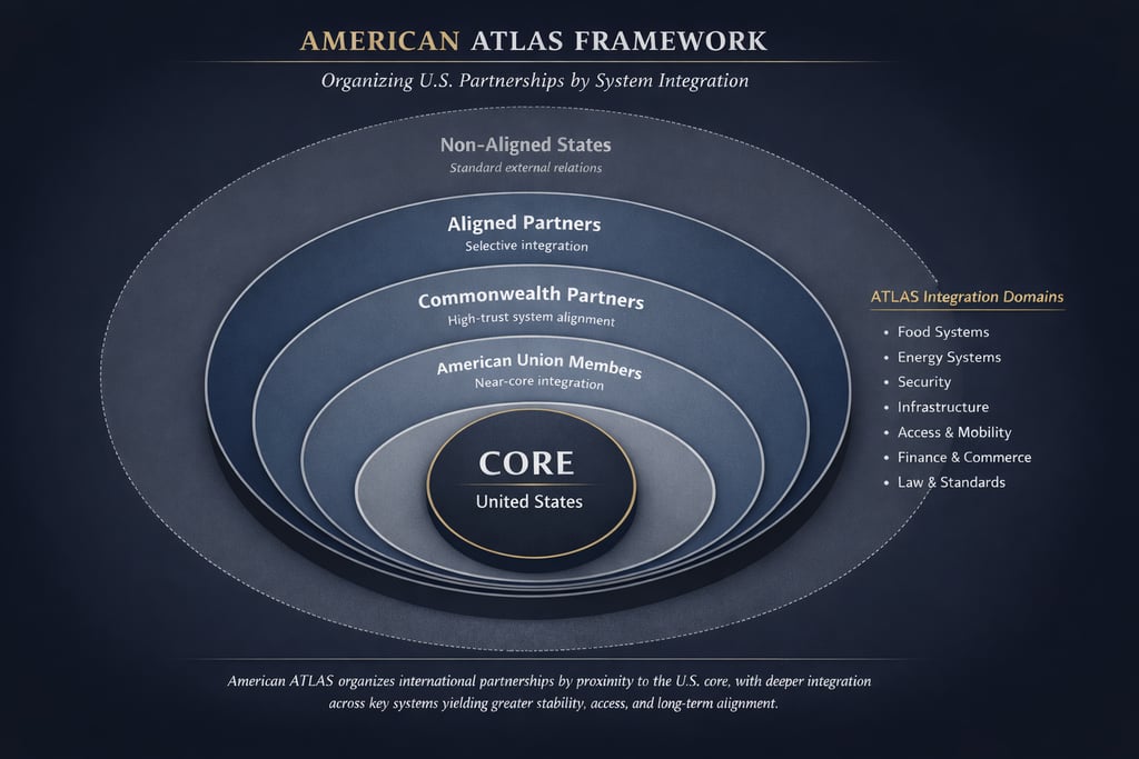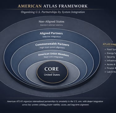 The American ATLAS Framework (American Trade, Law, Access & Security) addresses this problem by replacing ideology and ad hoc diplomacy with system integration. Rather than asking whether a nation shares American values or regional interests, ATLAS asks a more fundamental question: across how many foundational systems do our nations actually operate as one?