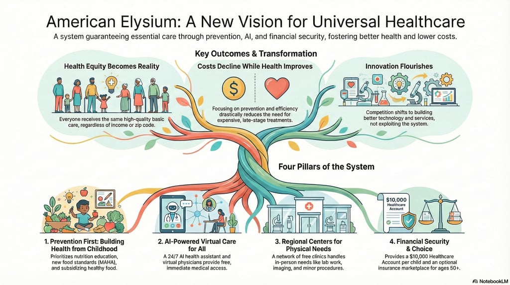 American Elysium proposes a different path: Universal Basic Healthcare that guarantees every American access to essential medical services while addressing the root causes of disease through nutrition, education, and prevention. This is not government-run healthcare or a single-payer system. It is a comprehensive approach that recognizes simple truths: in the 21st century, basic healthcare should be as accessible as clean water, preventing disease is better than treating it, and modern technology makes both possible.